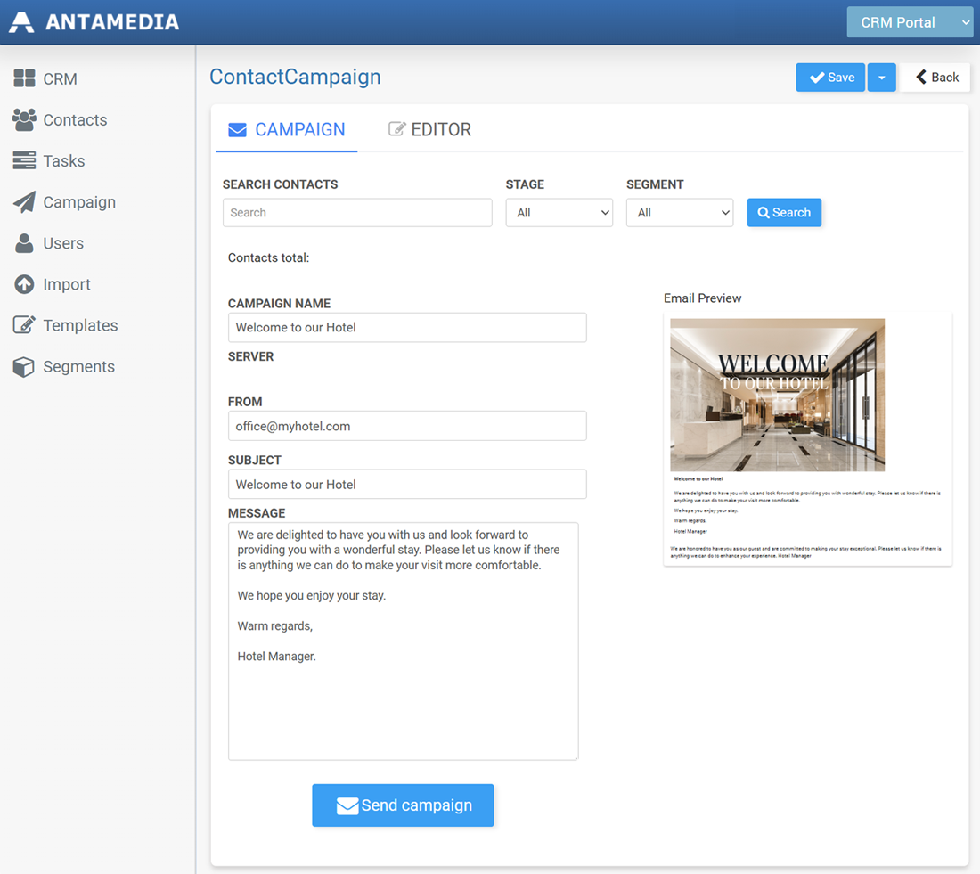 Antamedia CRM lets you send clear, effective messages to the right people at the right time. You can create email or WhatsApp campaigns, choose which contacts to reach based on their stage or segment, and send out messages directly from your dashboard.