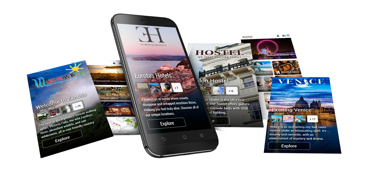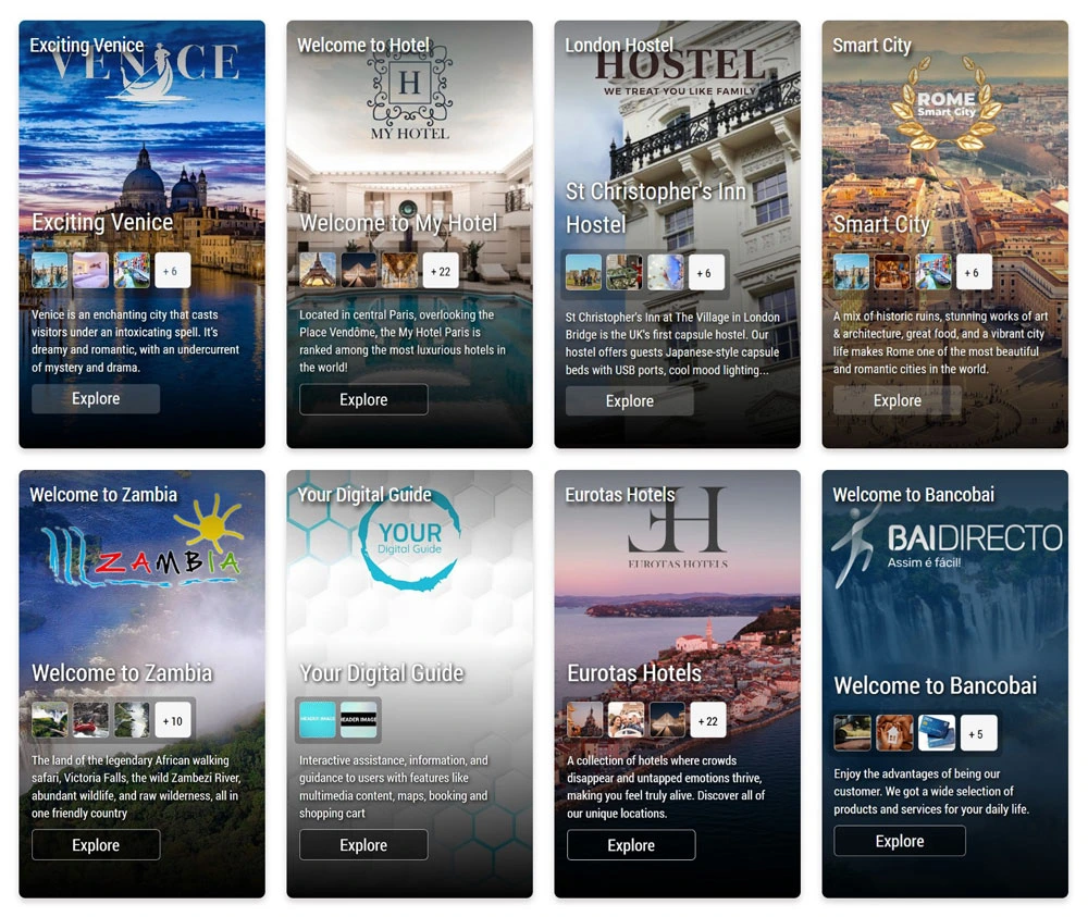 It can be used for hotels, resorts, restaurants, but also as a city guide, airport guide, or business product showcase with an integrated shopping cart.